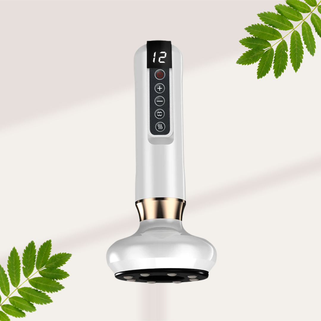 The device uses adjustable vacuum suction combined with heat therapy and gua sha scraping to help improve circulation, relieve muscle tension, and reduce the appearance of cellulite.